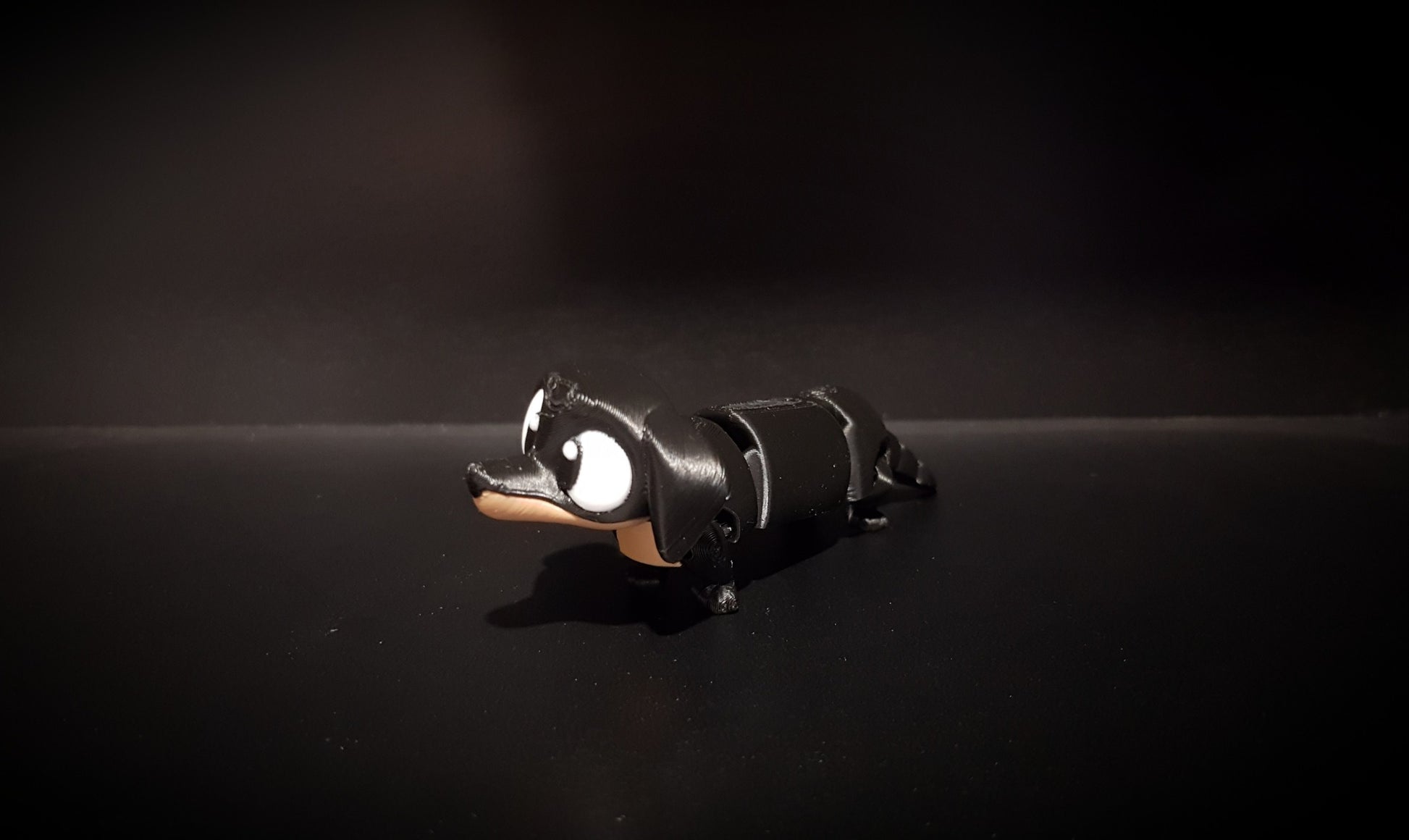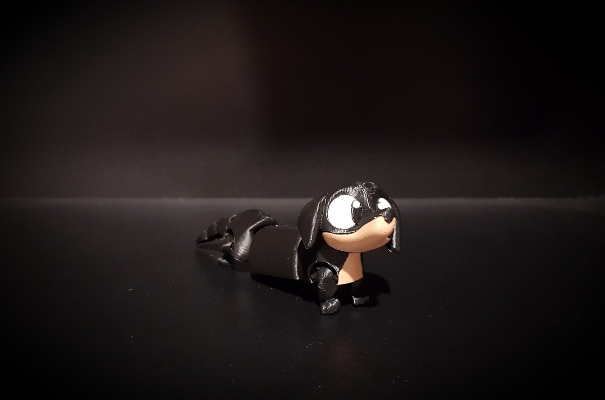 This mini sausage dog has a fully articulating body and legs, big expressive eyes and floppy ears.